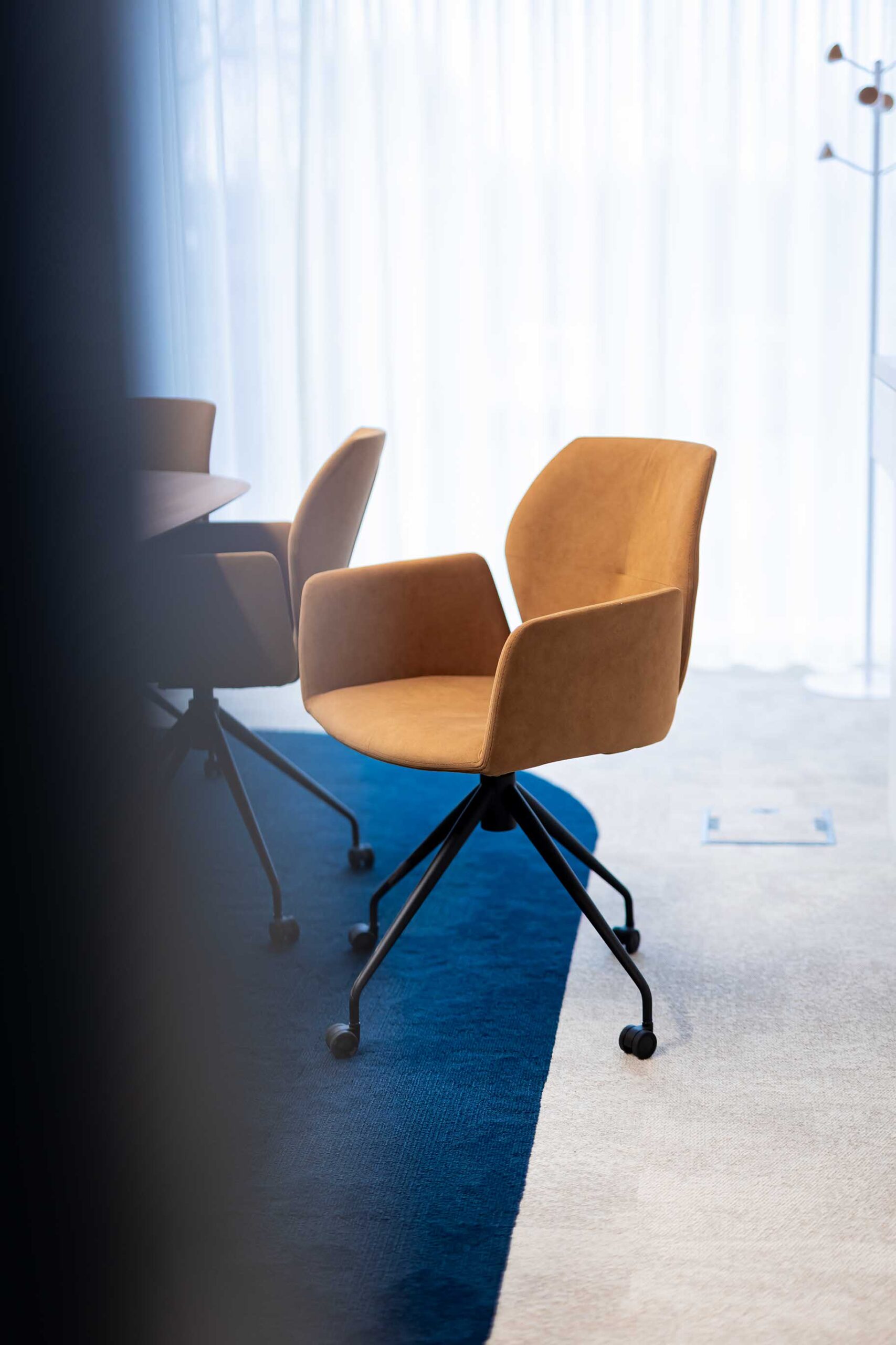 - Entrée et espace d’attente : Dès l’entrée, les encadrements bleu nuit soulignent l’identité visuelle et attirent le regard sur le logo, invitant naturellement à découvrir les différents espaces. L’aménagement mise sur des assises confortables et des matériaux chaleureux pour une expérience agréable dès les premiers instants.