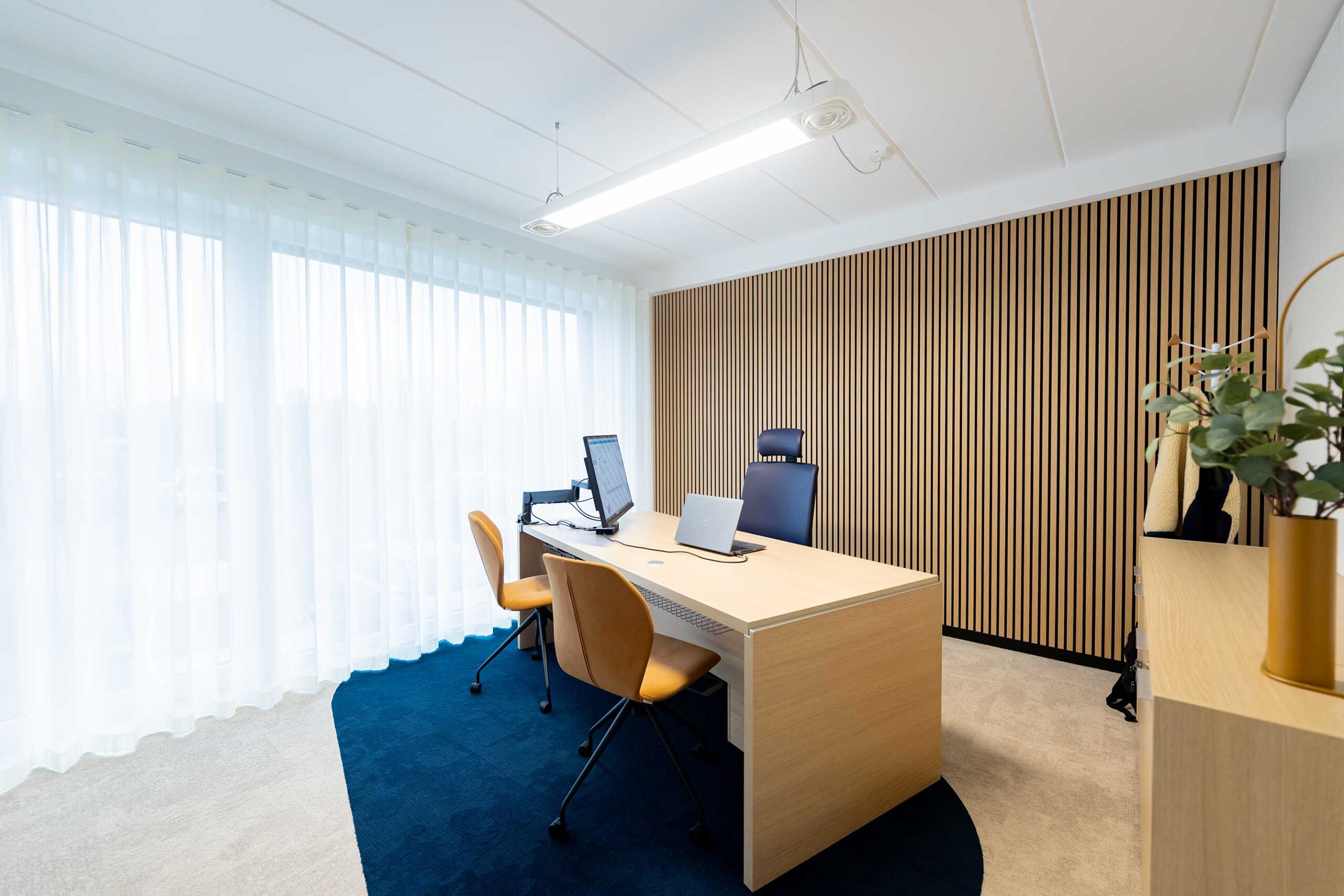 - Bureaux de direction : Ici, l’élégance et la fonctionnalité se rencontrent. L’accent a été mis sur des matériaux nobles et des finitions soignées. L’utilisation de mobilier existant, soigneusement intégré à l’aménagement, a permis d’allier durabilité et raffinement.