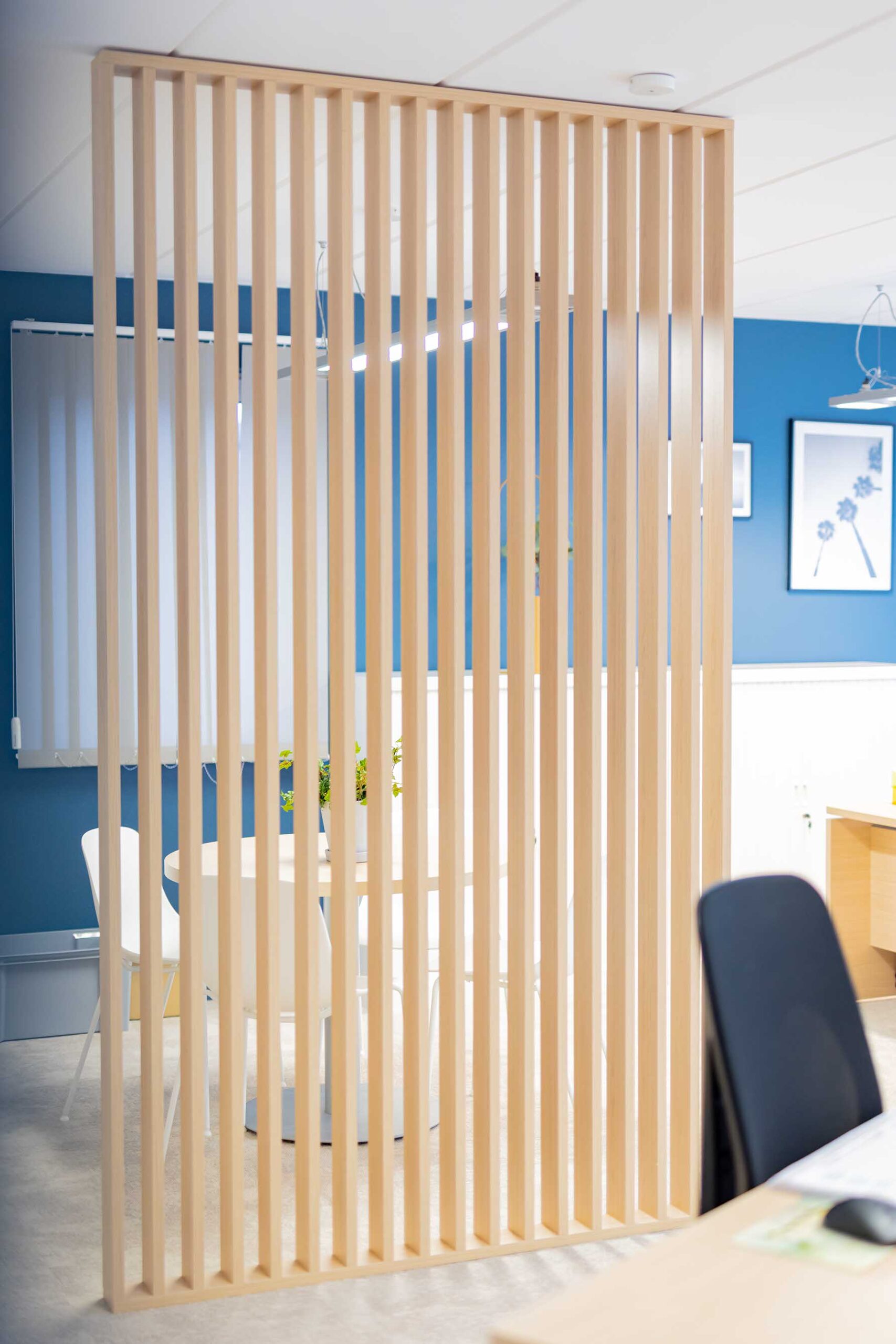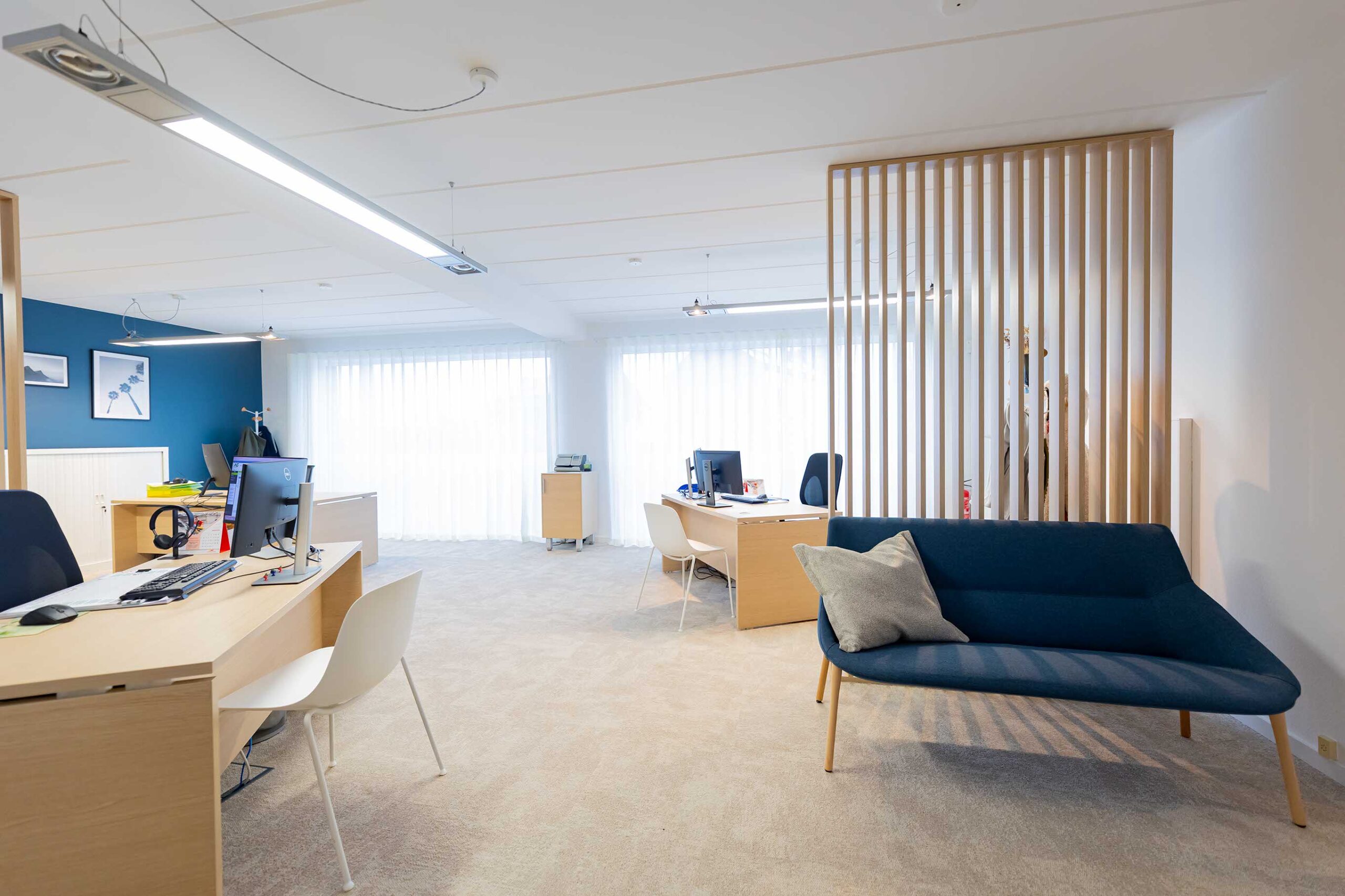 - Salles de réunion et openspace : Ces espaces ont été optimisés pour le confort et la concentration. Les solutions acoustiques réduisent les nuisances sonores, tandis que le mobilier de bureau ergonomique favorise une posture saine et un cadre de travail performant. La lumière naturelle est mise en valeur pour renforcer la sensation de bien-être.