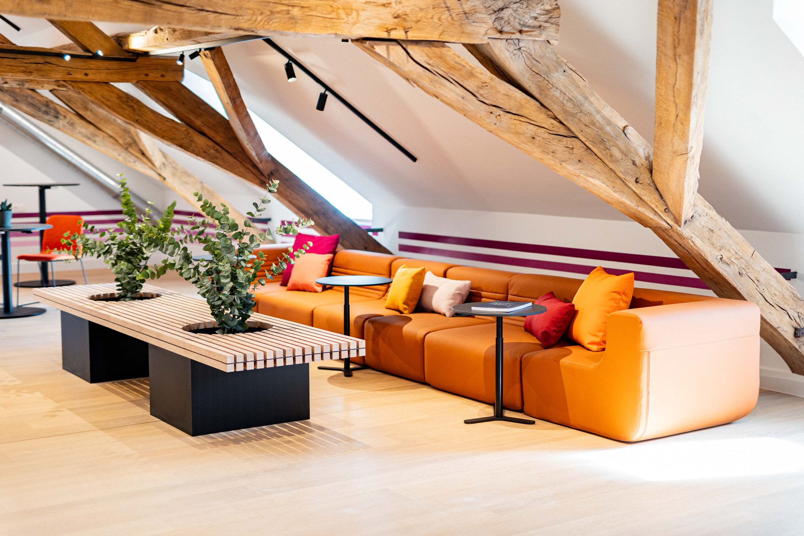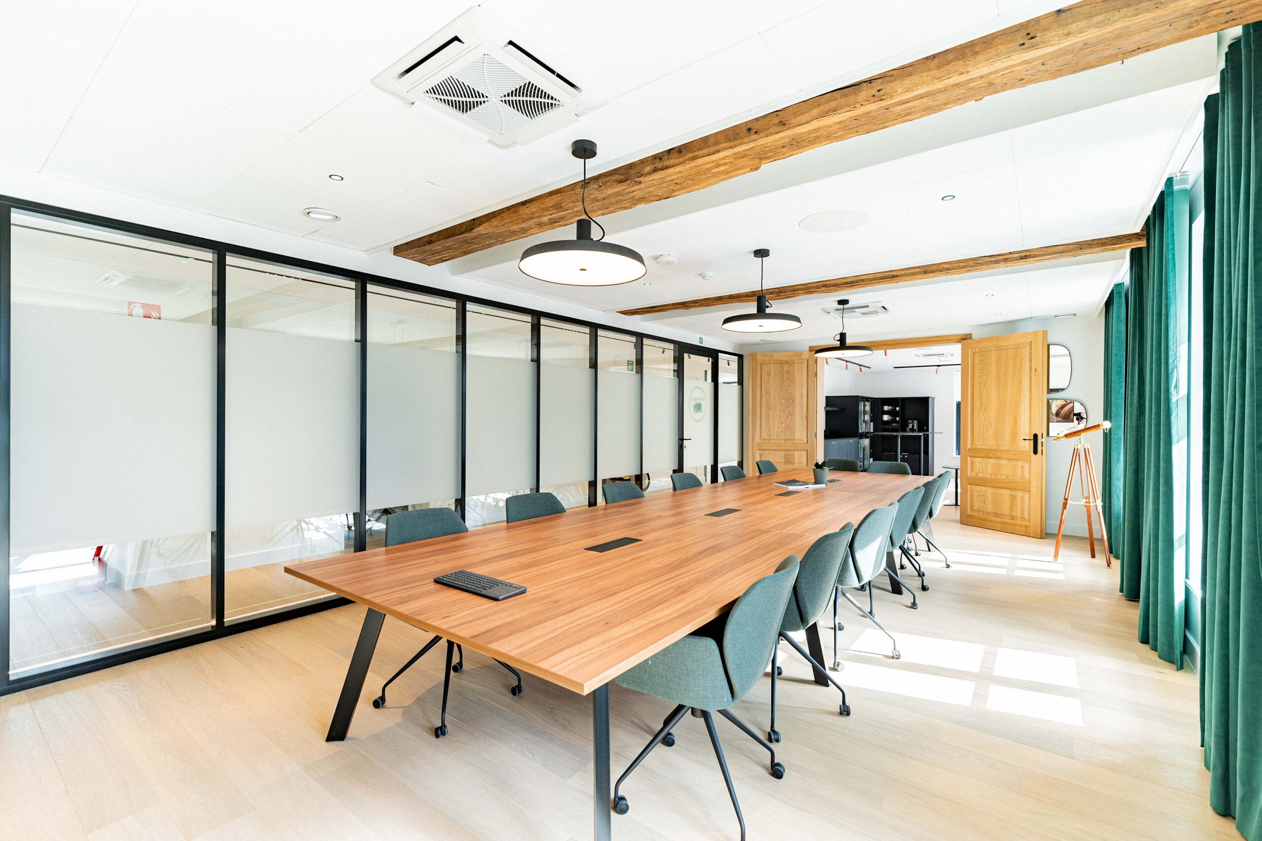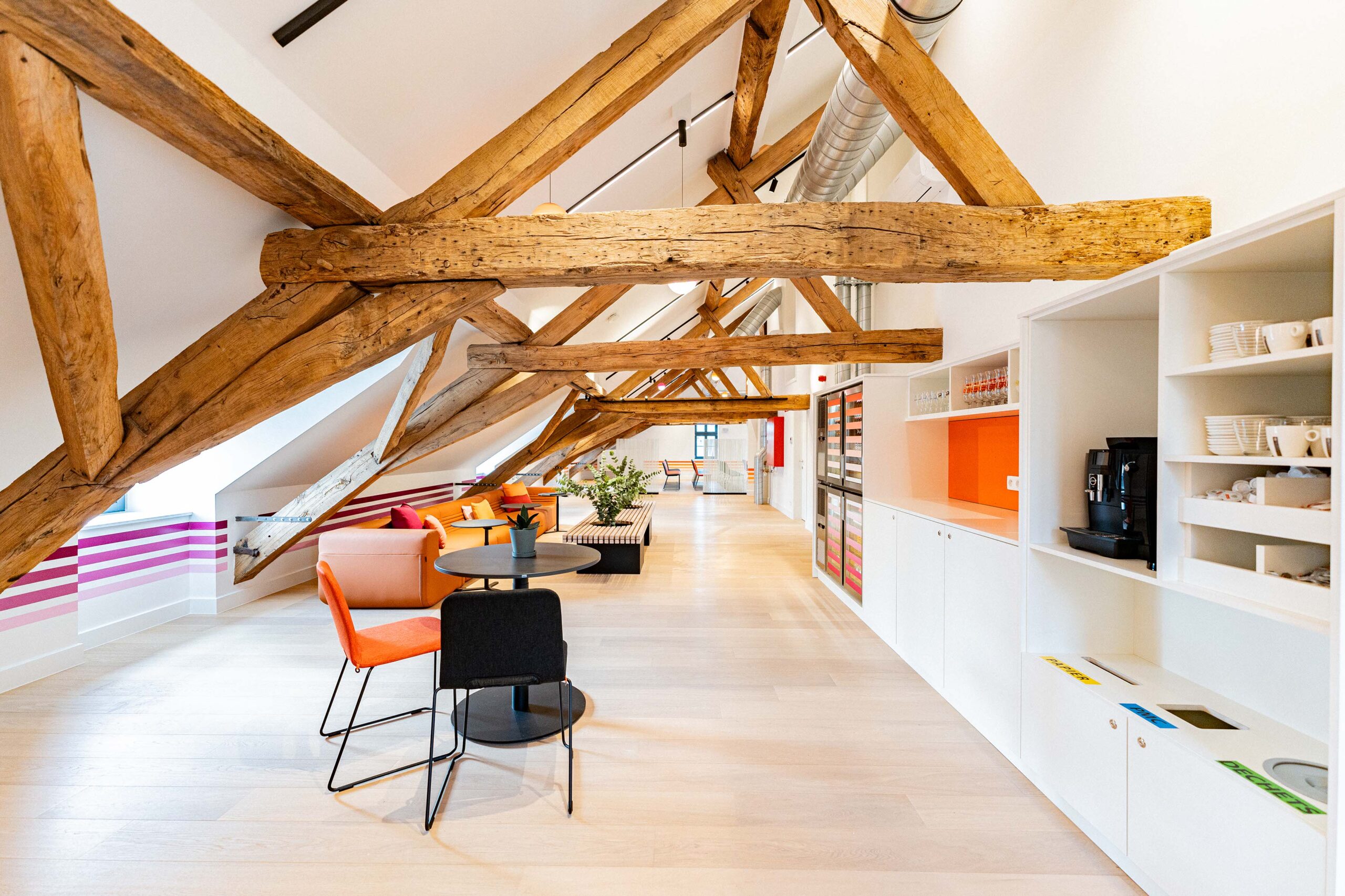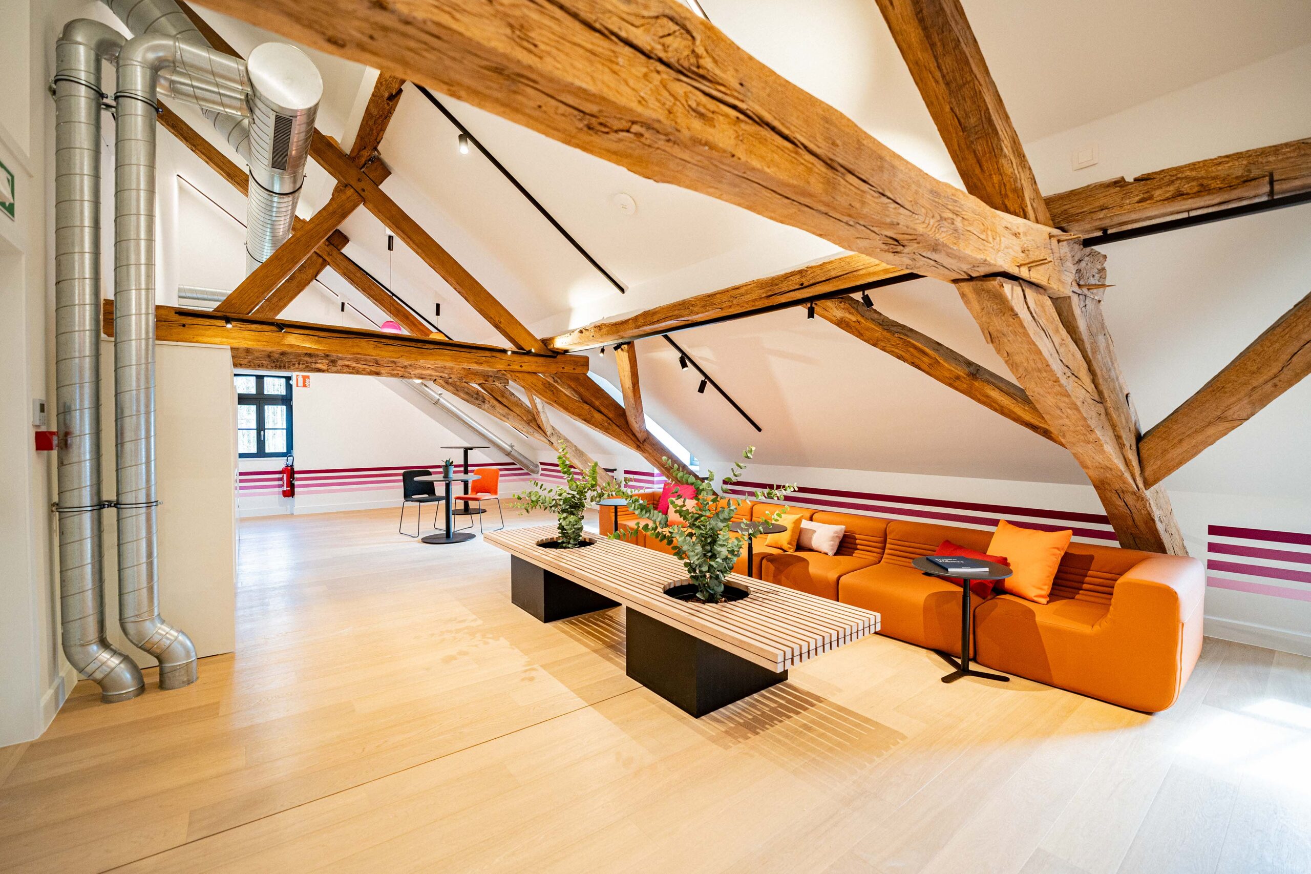 Nous avons réalisé la réhabilitation complète de l’intérieur, tout en respectant notre engagement Design & Build éco-responsable. Premièrement, cela inclut la pose de cloisons pour structurer les espaces. Ensuite, nous avons procédé à la rénovation des sols avec des matériaux acoustiques pour améliorer le confort sonore. De plus, l’installation d’un éclairage LED économe en énergie a permis d’optimiser l’efficacité énergétique. Par ailleurs, nous avons soigneusement choisi du mobilier confortable, ergonomique et durable. En somme, ce projet illustre parfaitement notre capacité à créer des espaces modulables, où tradition et modernité coexistent harmonieusement.