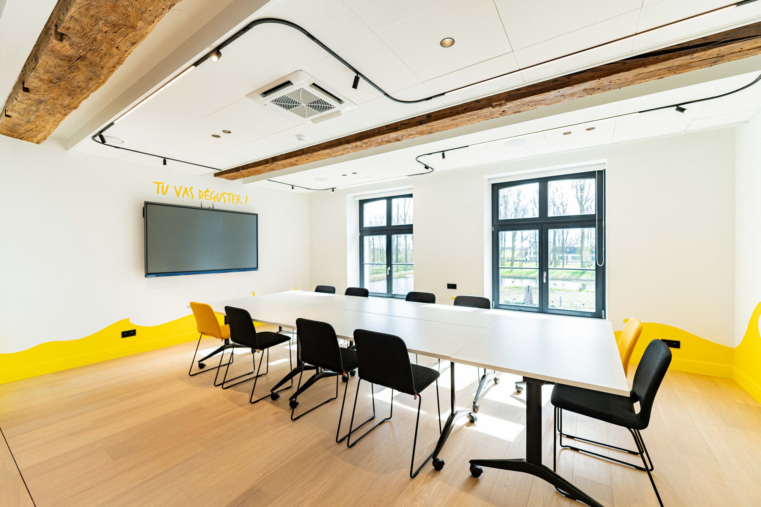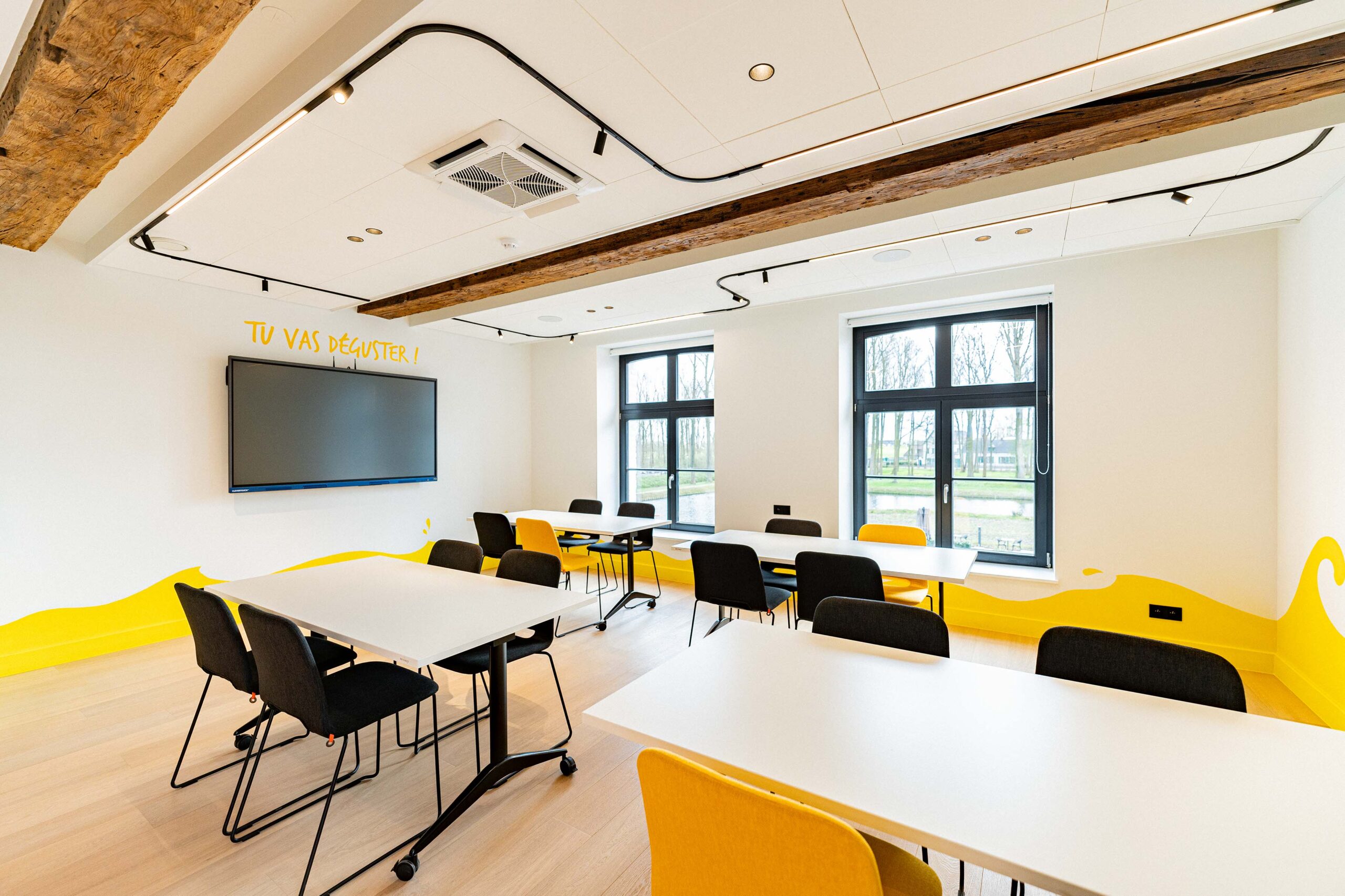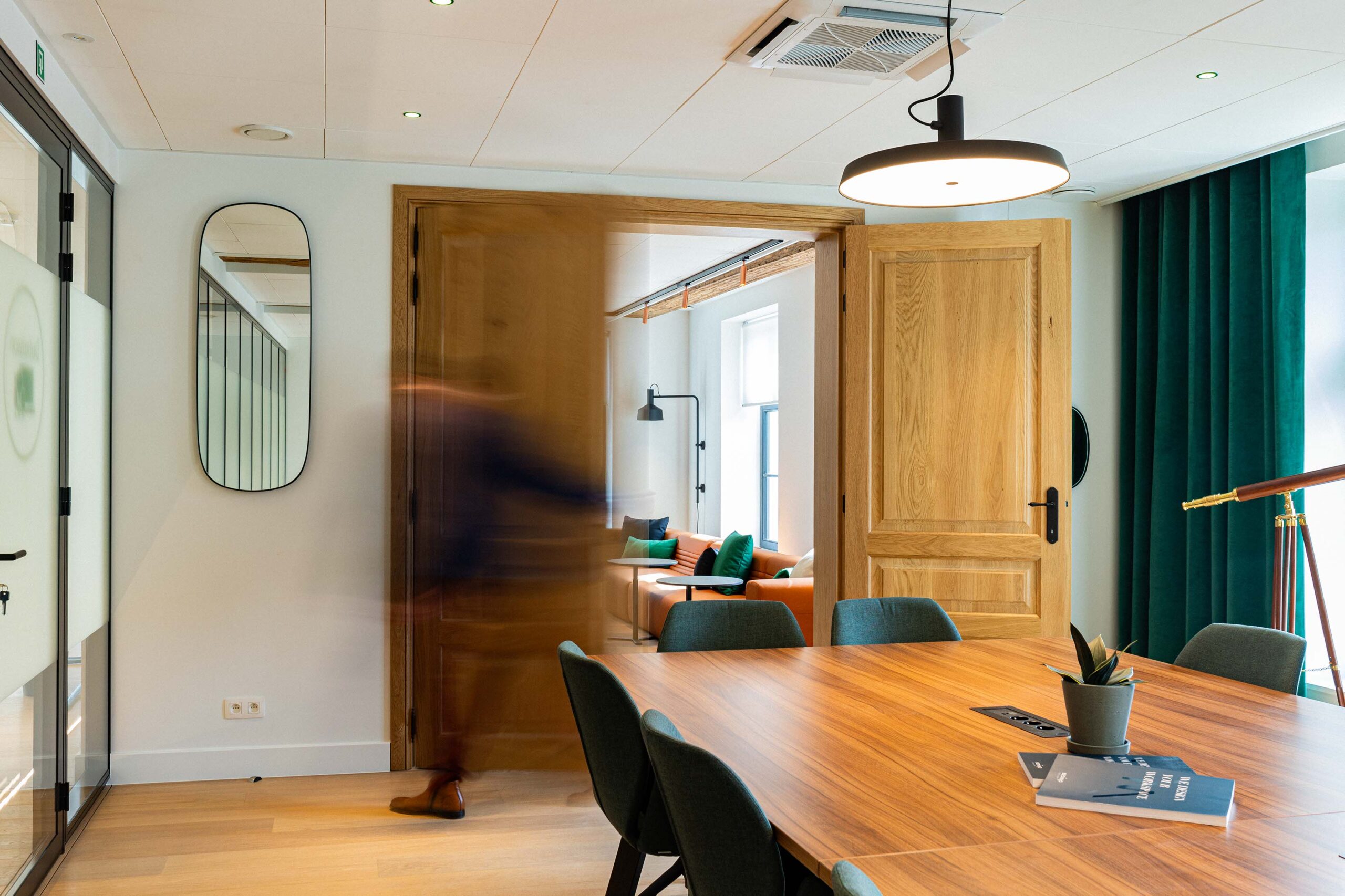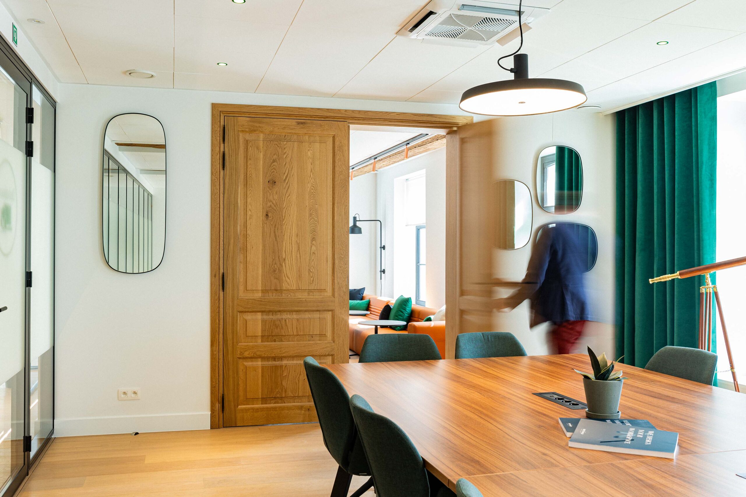 Nous avons réalisé la réhabilitation complète de l’intérieur, tout en respectant notre engagement Design & Build éco-responsable. Premièrement, cela inclut la pose de cloisons pour structurer les espaces. Ensuite, nous avons procédé à la rénovation des sols avec des matériaux acoustiques pour améliorer le confort sonore. De plus, l’installation d’un éclairage LED économe en énergie a permis d’optimiser l’efficacité énergétique. Par ailleurs, nous avons soigneusement choisi du mobilier confortable, ergonomique et durable. En somme, ce projet illustre parfaitement notre capacité à créer des espaces modulables, où tradition et modernité coexistent harmonieusement.
