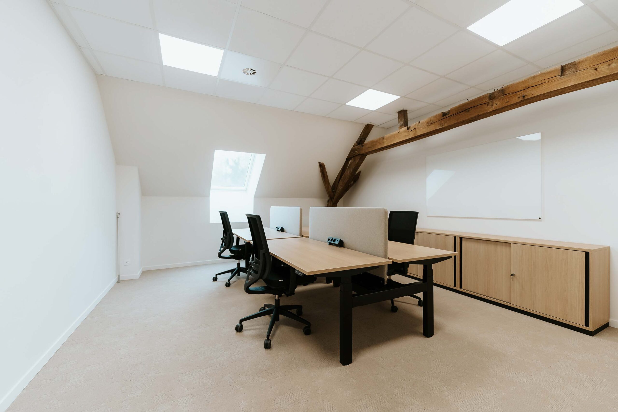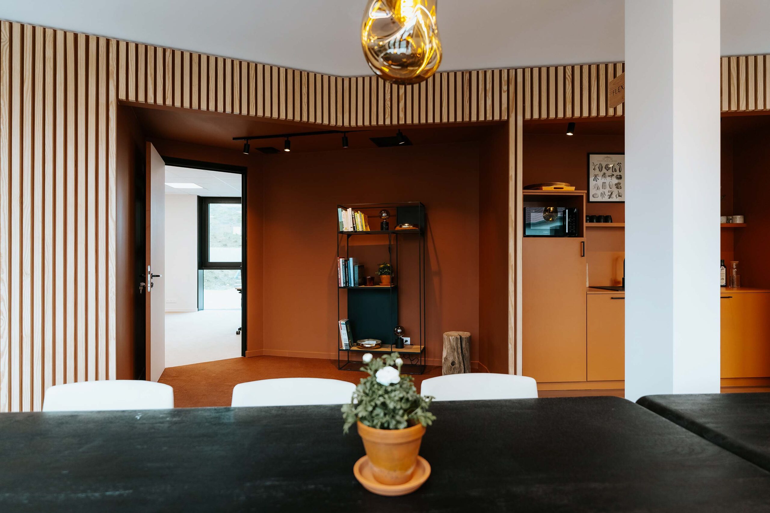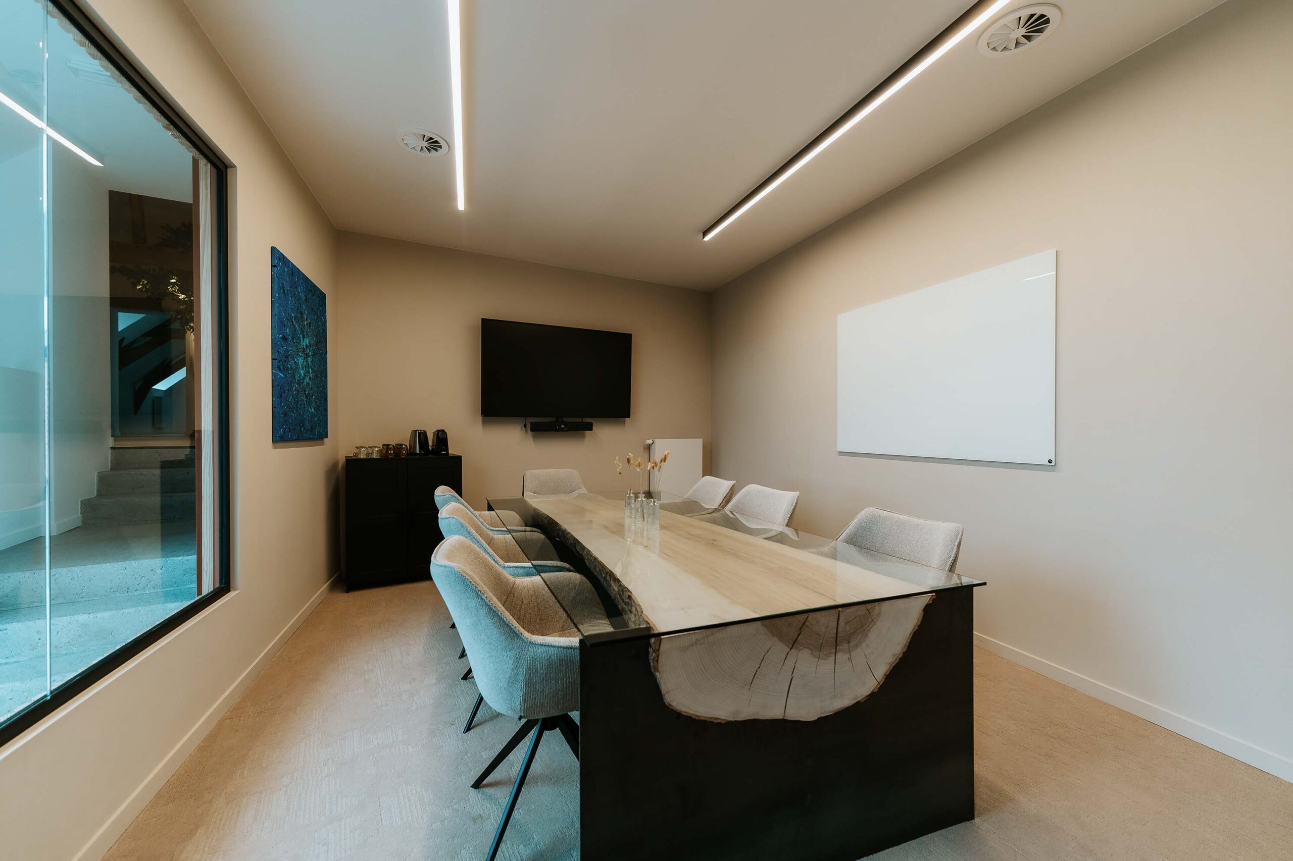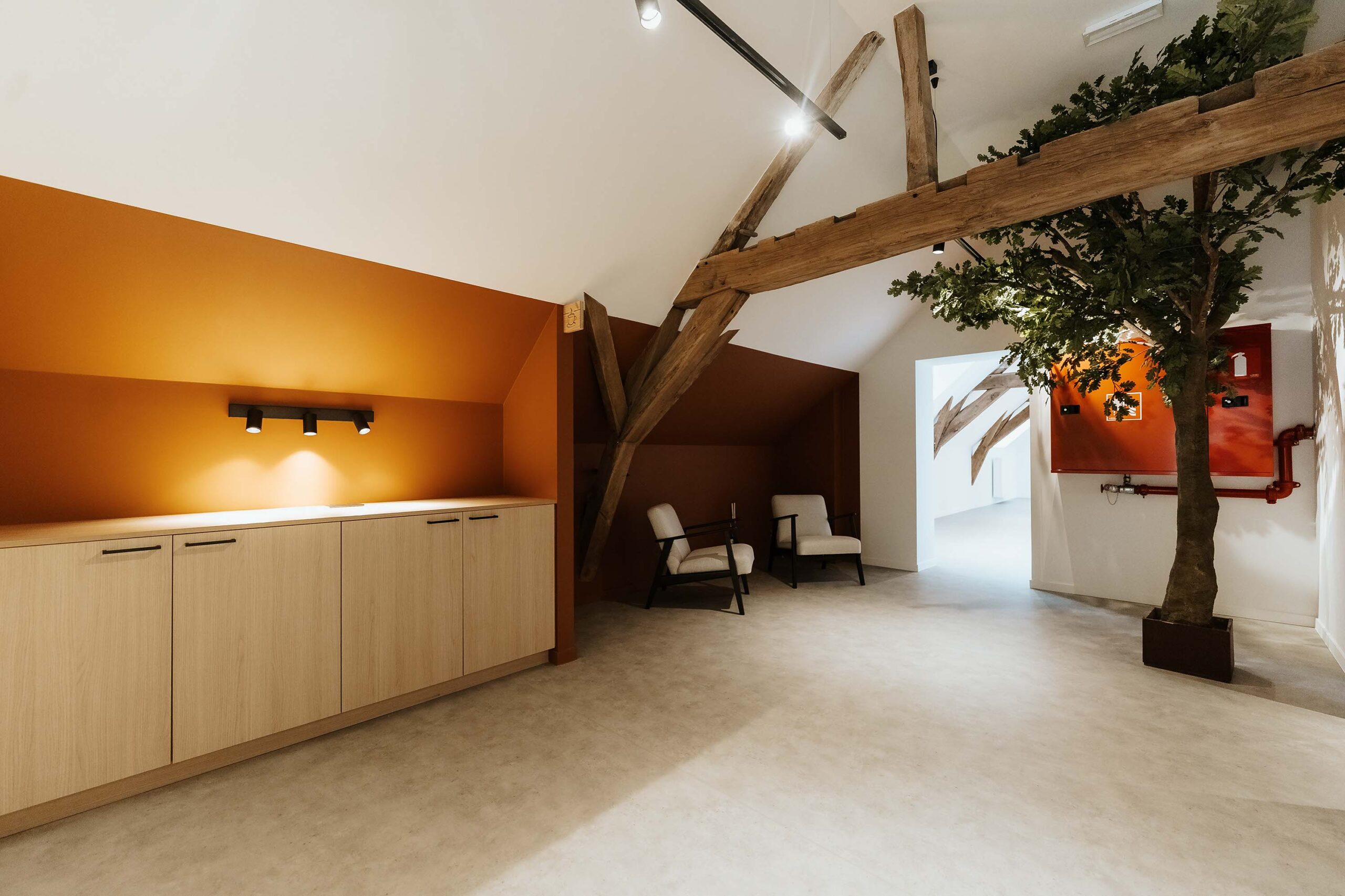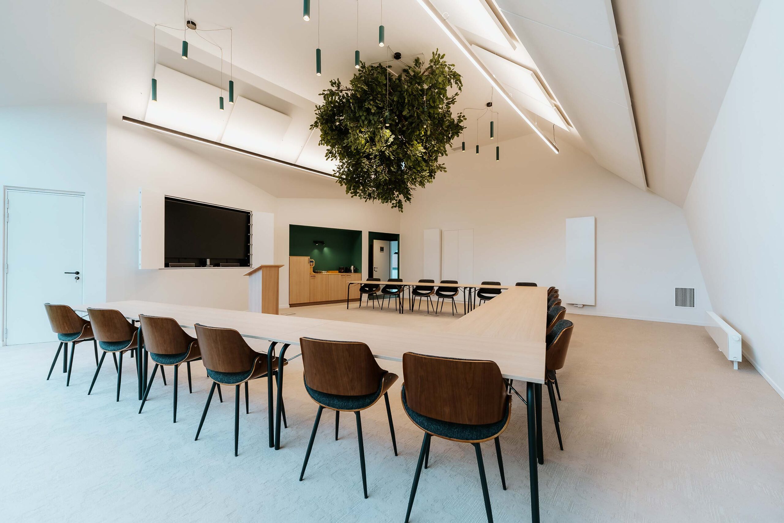 Un des aspects centraux de ce projet est la création de trois salles de réunion, chacune inspirée par la nature. Chaque salle représente une étape de la croissance d’un arbre. La Salle Racines est dédiée au brainstorming et à la naissance des idées. L’aménagement stimule la créativité et favorise l’échange. La Salle Tronc symbolise la stabilité. Son élément phare est une table en bois sur mesure, faite à partir d’un tronc d’arbre choisi par le client. Enfin, la Salle Houppier offre une vue panoramique, idéale pour les séminaires. Ces salles s’inscrivent dans une logique de conception de bureaux flexibles, permettant de moduler leur utilisation selon les besoins.