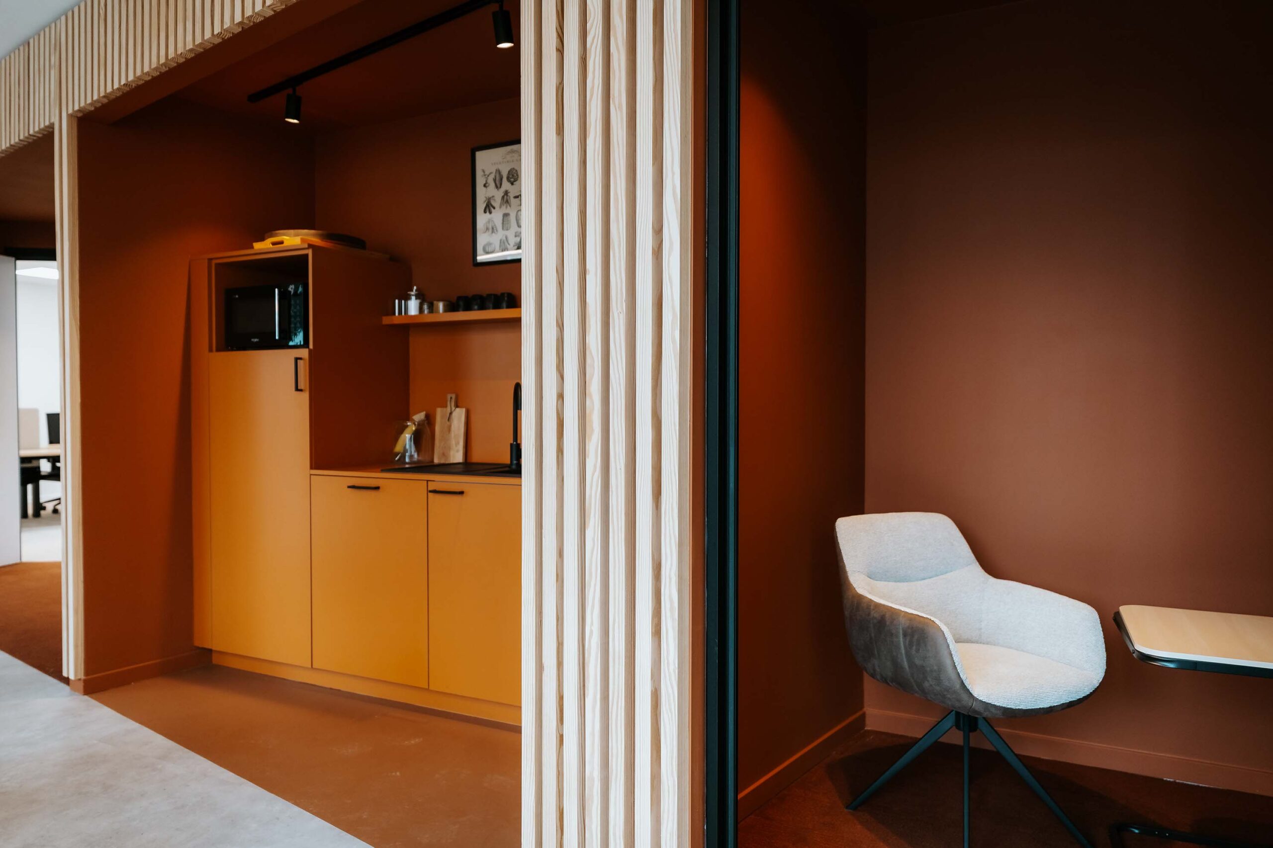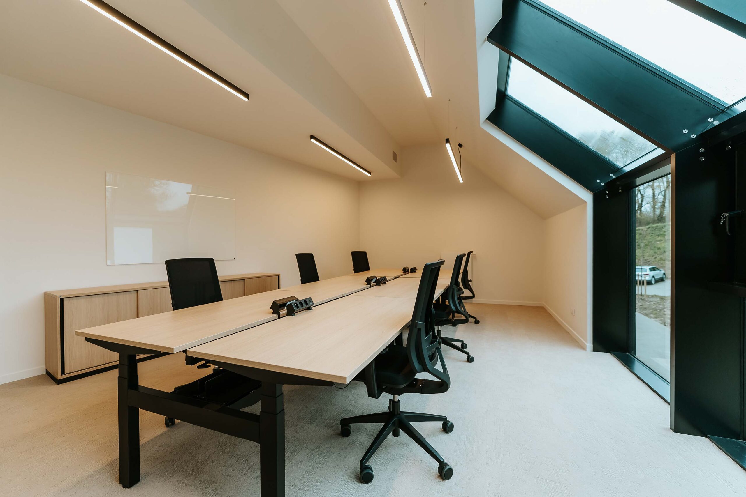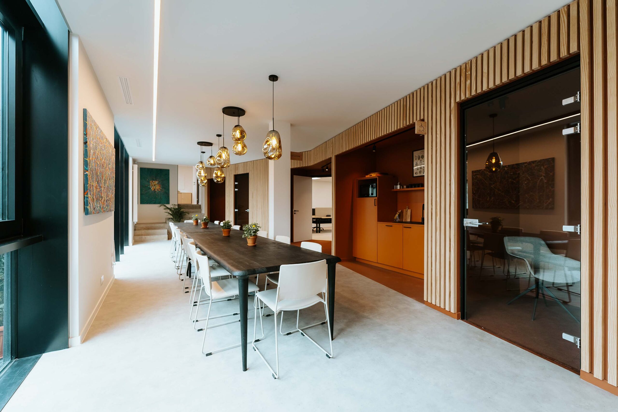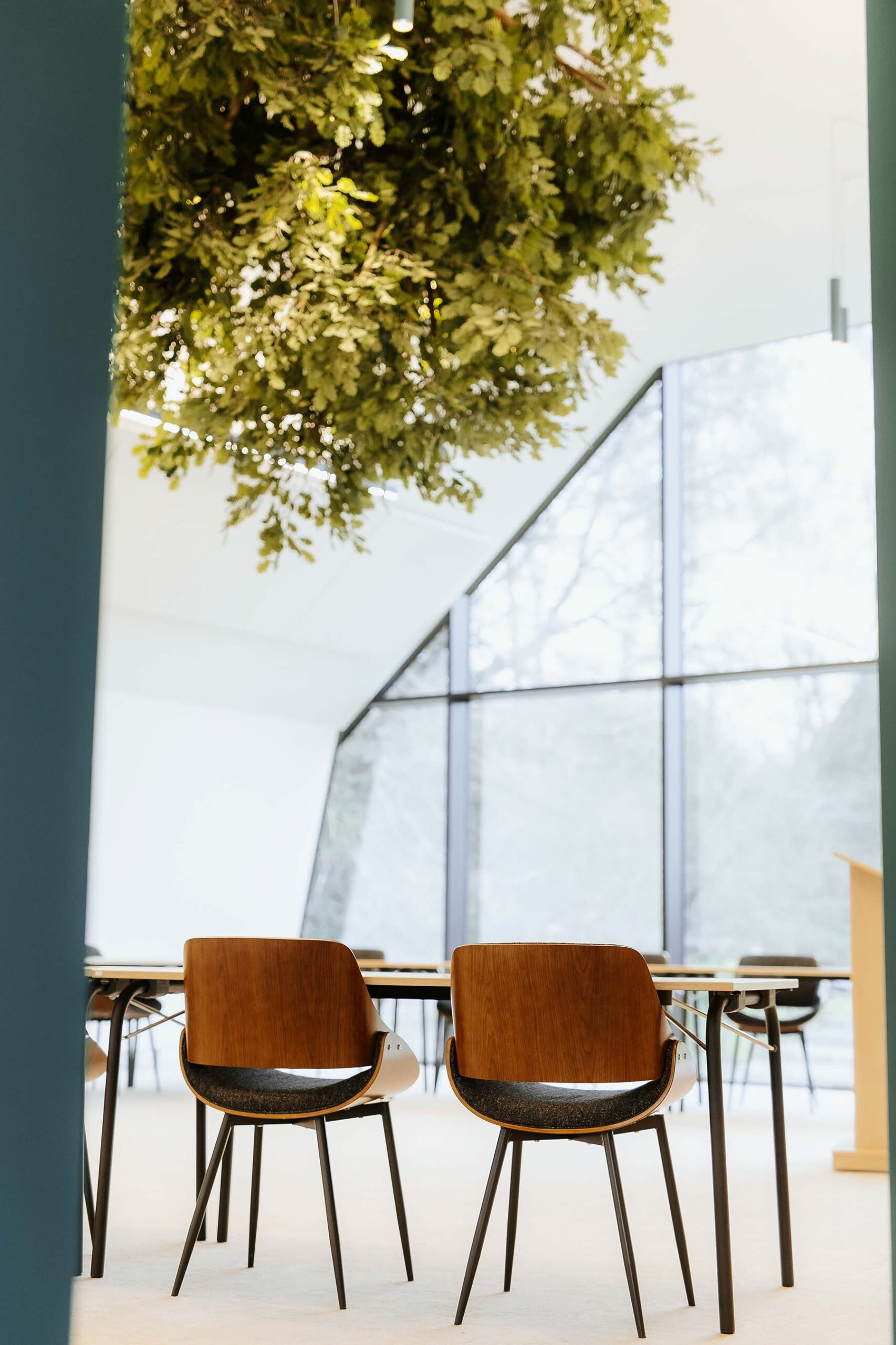 Un des aspects centraux de ce projet est la création de trois salles de réunion, chacune inspirée par la nature. Chaque salle représente une étape de la croissance d’un arbre. La Salle Racines est dédiée au brainstorming et à la naissance des idées. L’aménagement stimule la créativité et favorise l’échange. La Salle Tronc symbolise la stabilité. Son élément phare est une table en bois sur mesure, faite à partir d’un tronc d’arbre choisi par le client. Enfin, la Salle Houppier offre une vue panoramique, idéale pour les séminaires. Ces salles s’inscrivent dans une logique de conception de bureaux flexibles, permettant de moduler leur utilisation selon les besoins.