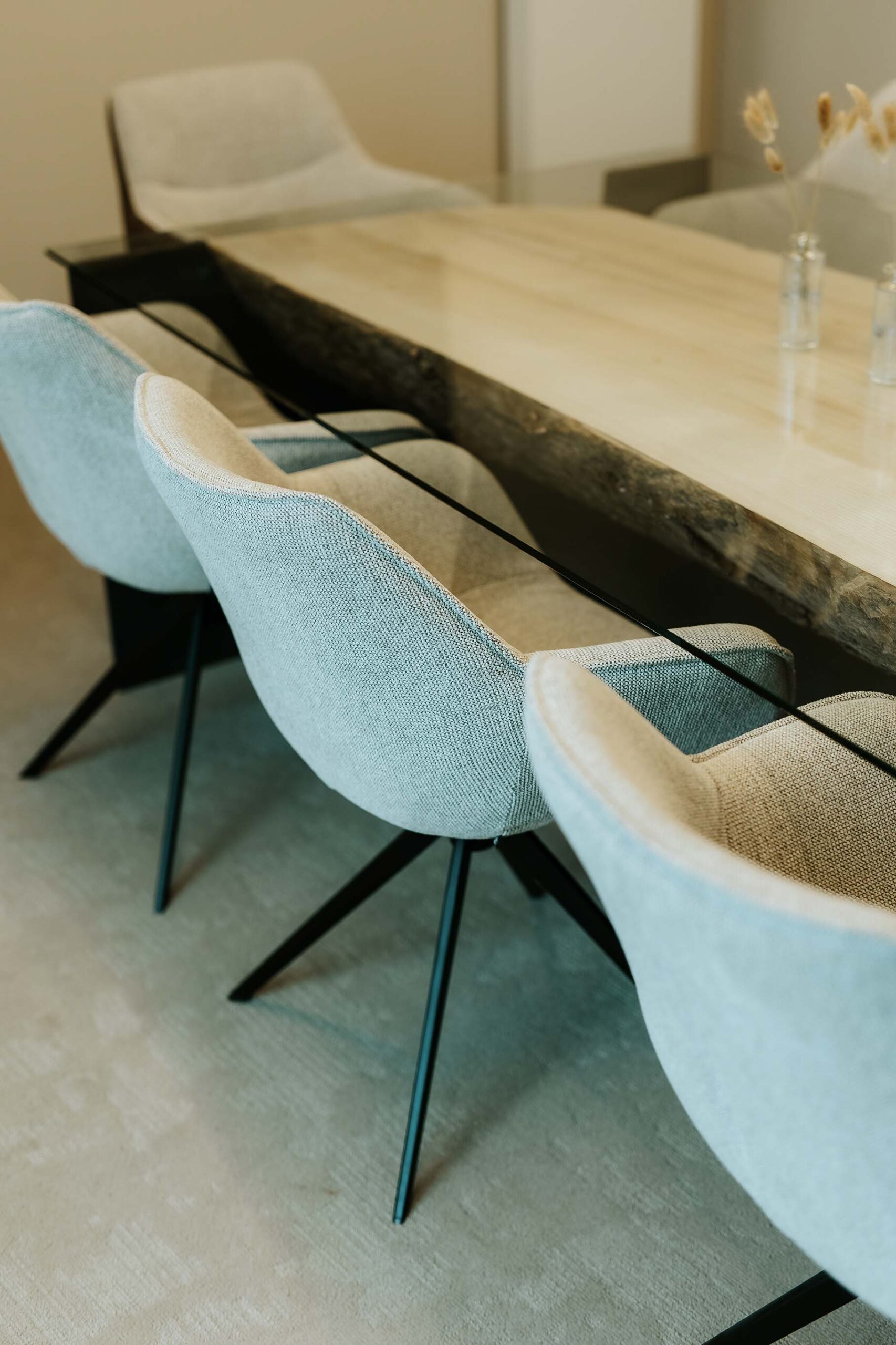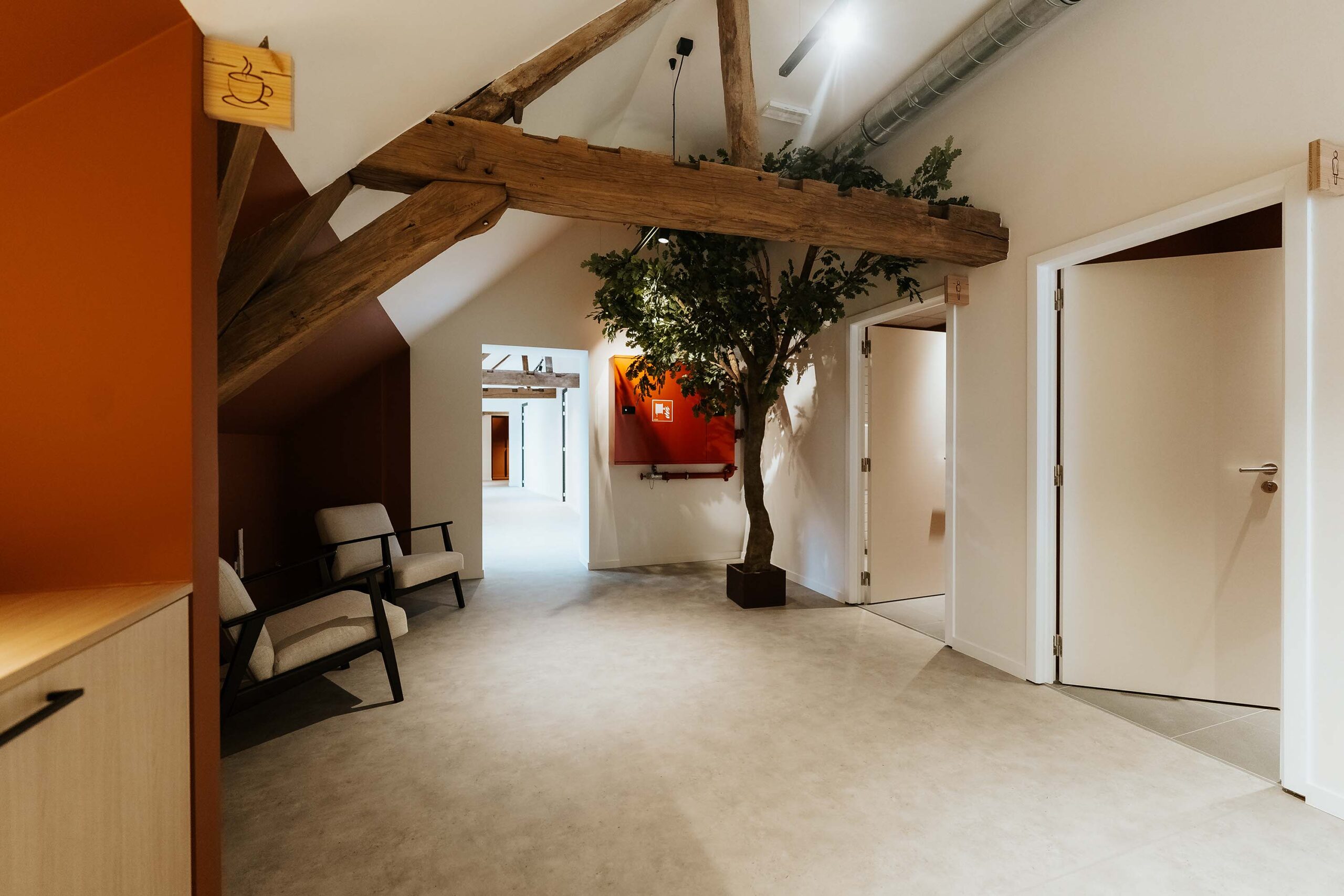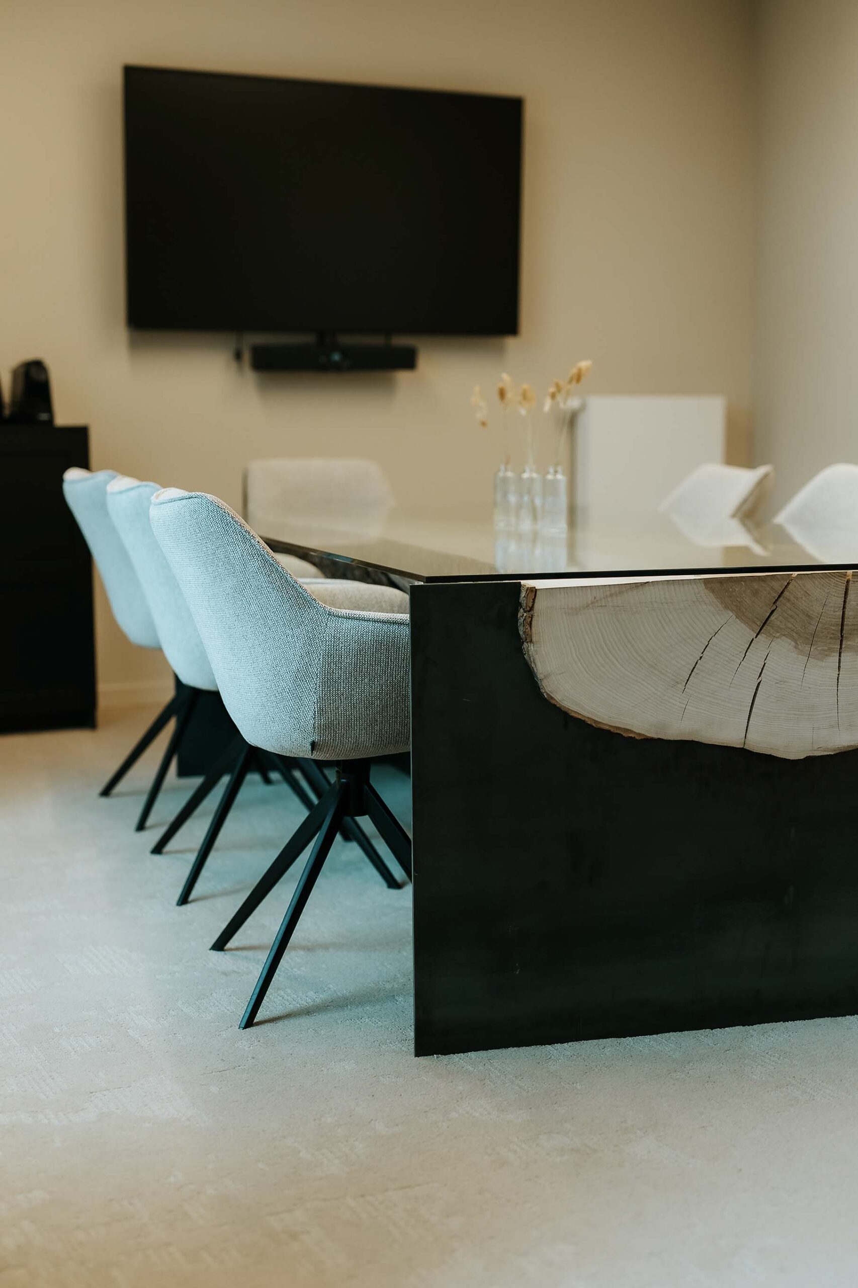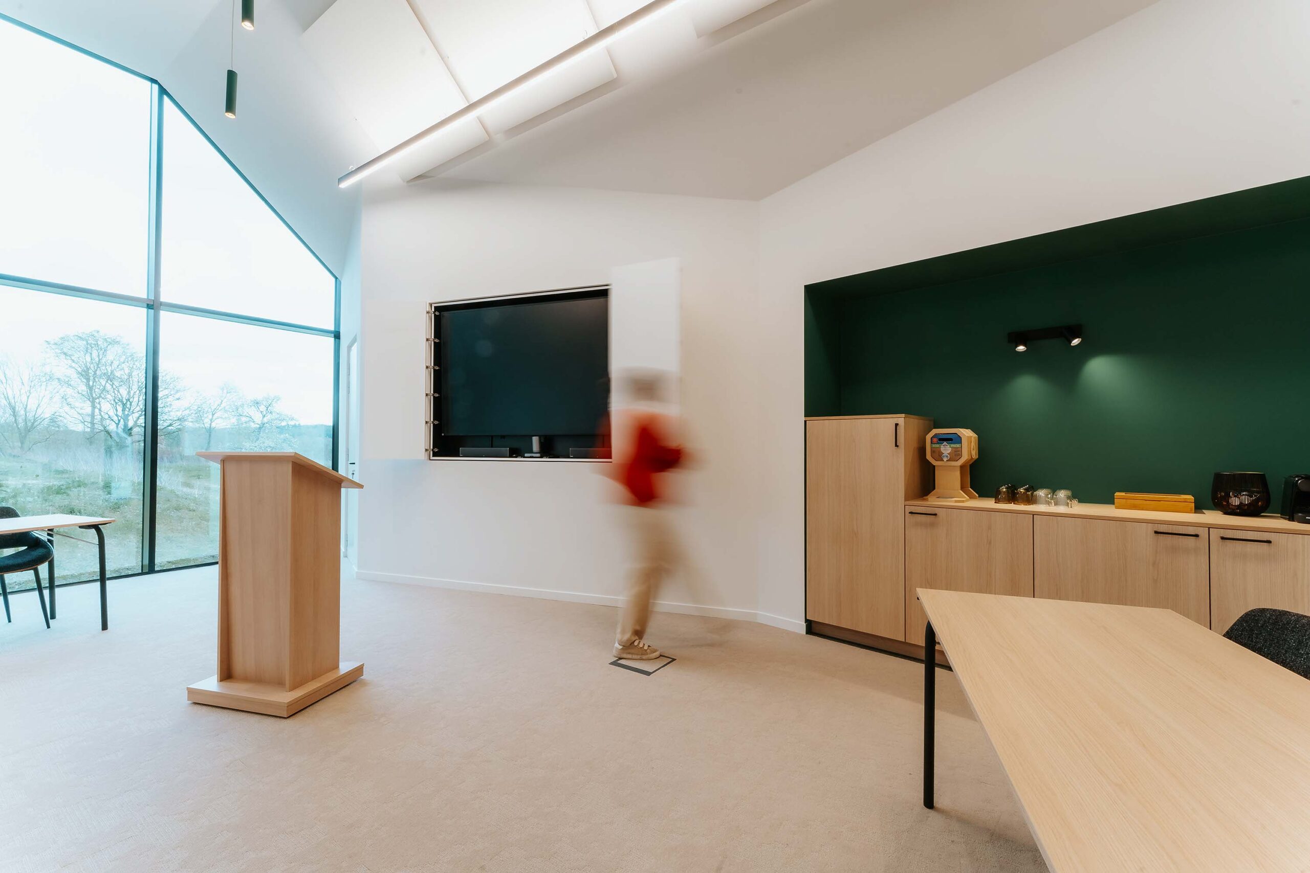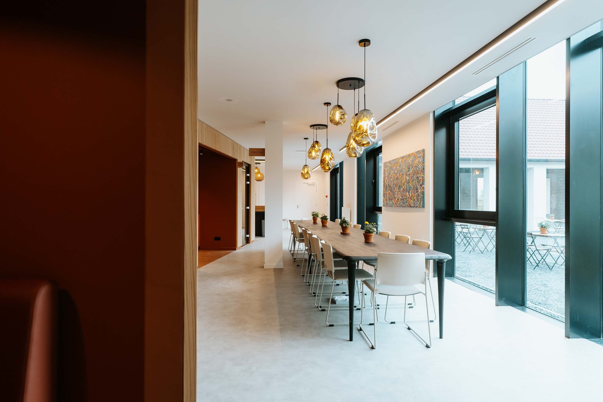 Un des aspects centraux de ce projet est la création de trois salles de réunion, chacune inspirée par la nature. Chaque salle représente une étape de la croissance d’un arbre. La Salle Racines est dédiée au brainstorming et à la naissance des idées. L’aménagement stimule la créativité et favorise l’échange. La Salle Tronc symbolise la stabilité. Son élément phare est une table en bois sur mesure, faite à partir d’un tronc d’arbre choisi par le client. Enfin, la Salle Houppier offre une vue panoramique, idéale pour les séminaires. Ces salles s’inscrivent dans une logique de conception de bureaux flexibles, permettant de moduler leur utilisation selon les besoins.